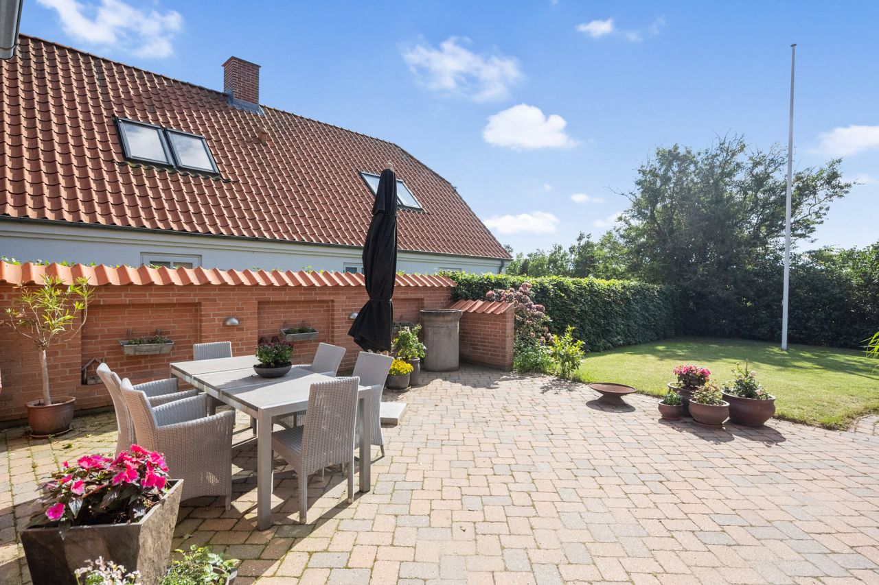 Udendørs kan I glæde jer over den skønne have med to ugenerte og store sydvestvendte terrasser - ideelle steder at nyde livet i ro og mag. Der er således kun naboer på to af siderne. Huset grænser op til en mark.